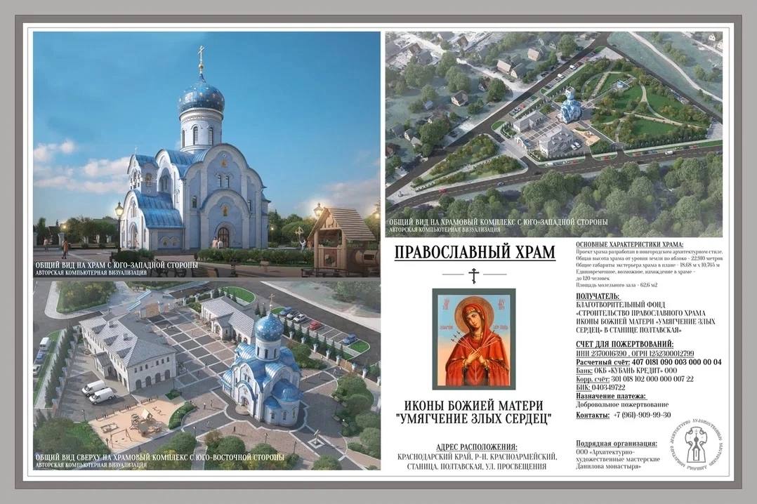 Из официальных источников стало известно о возможности уже в ближайшее время приступить к строительству нового храма — иконы Божией Матери «Умягчение злых сердец» — в станице Полтавской (район старого кладбища).