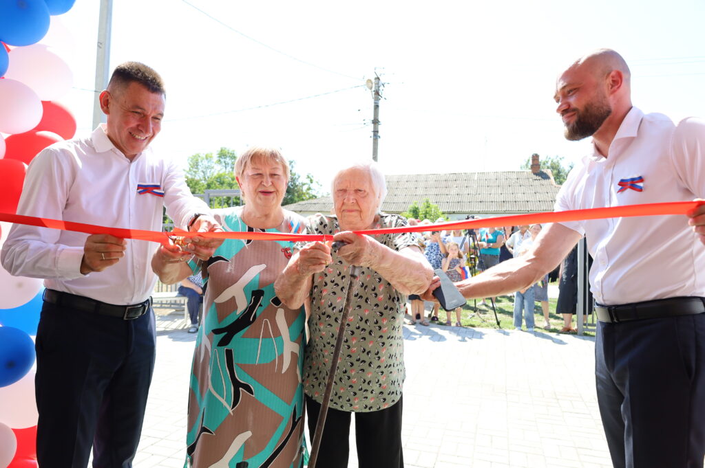 Право торжественного перерезания ленты и открытия нового здания ФАПа предоставлено двум фельдшерам, ранее работавшим здесь, в посёлке Краснодарском: Валентине Николаевне Мишиной, 30 лет отработавшей в ФАПе, и Валентине Ивановне Авксентьевой, отдавшей пункту 20 лет жизни. Фото пресс-службы администрации района