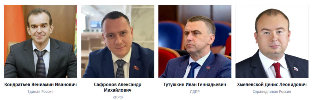 «Зарегистрированы четыре кандидата: Вениамин Кондратьев, выдвинутый Краснодарским региональным отделением Всероссийской политической партии «Единая Россия», Александр Сафронов, выдвинутый Краснодарским краевым отделением политической партии «Коммунистическая партия Российской Федерации», Иван Геннадьевич Тутушкин, выдвинутый Краснодарским региональным отделением Политической партии ЛДПР — Либерально-демократической партии России, Денис Леонидович Хмелевской, выдвинутый региональным отделением Социалистической политической партии «Справедливая Россия — патриоты — за правду» в Краснодарском крае», — говорится в сообщении комиссии.