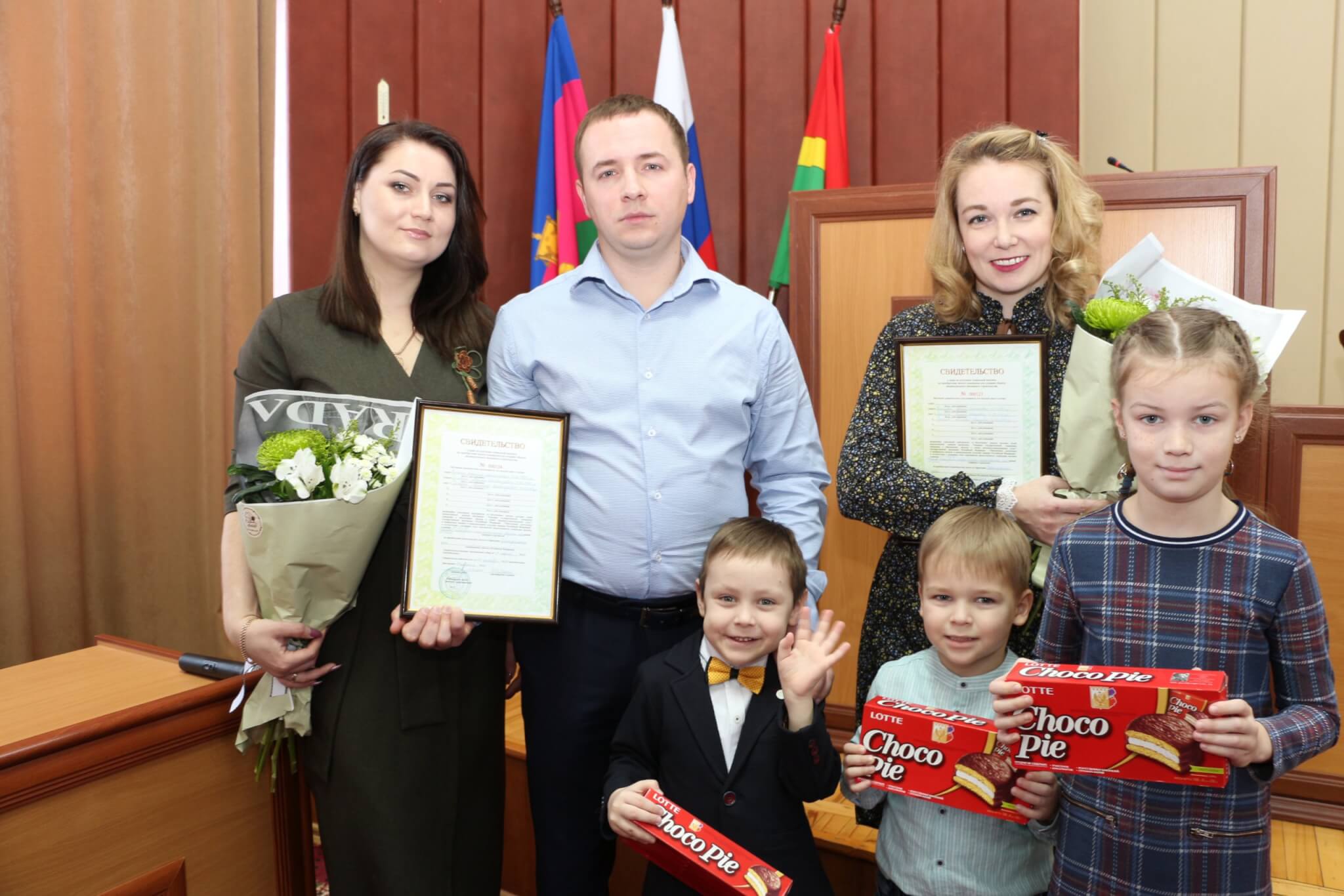 Глава района Юрий Васин на большом планерном совещании вручил Ирине Горшковой из Полтавской и Александру Дьяченко из Марьянской сертификаты на получение социальной выплаты.